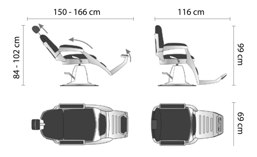 Structure, footrest and armrests in die-cast aluminum, polished and satin. Backrest, seat, armrests and footrest inserts in foamed polyurethane. Skai upholstery of your choice. Retractable headrest, adjustable and removable. Synchronous reclining mechanism for backrest and legrest. Base with hydraulic pump and brake.